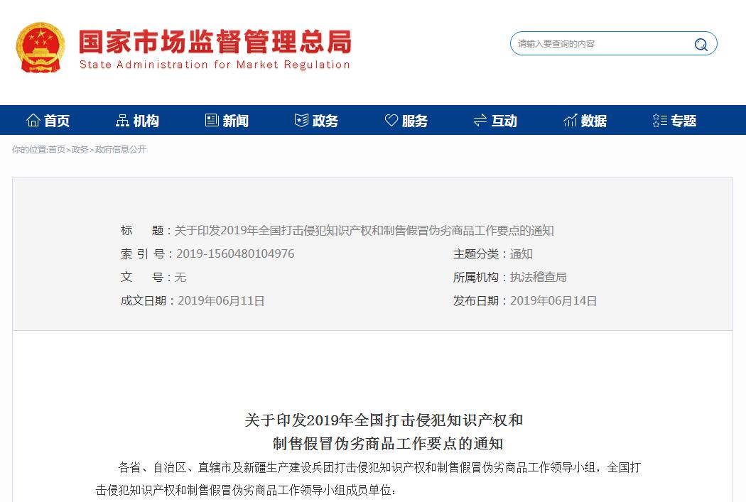 6月,全国打击侵犯知识产权和制售假冒伪劣商品工作领导小组印发《2019年全国打击侵犯知识产权.